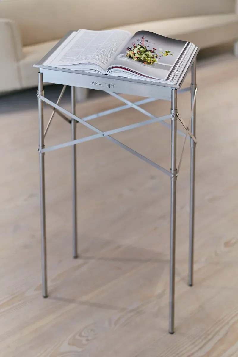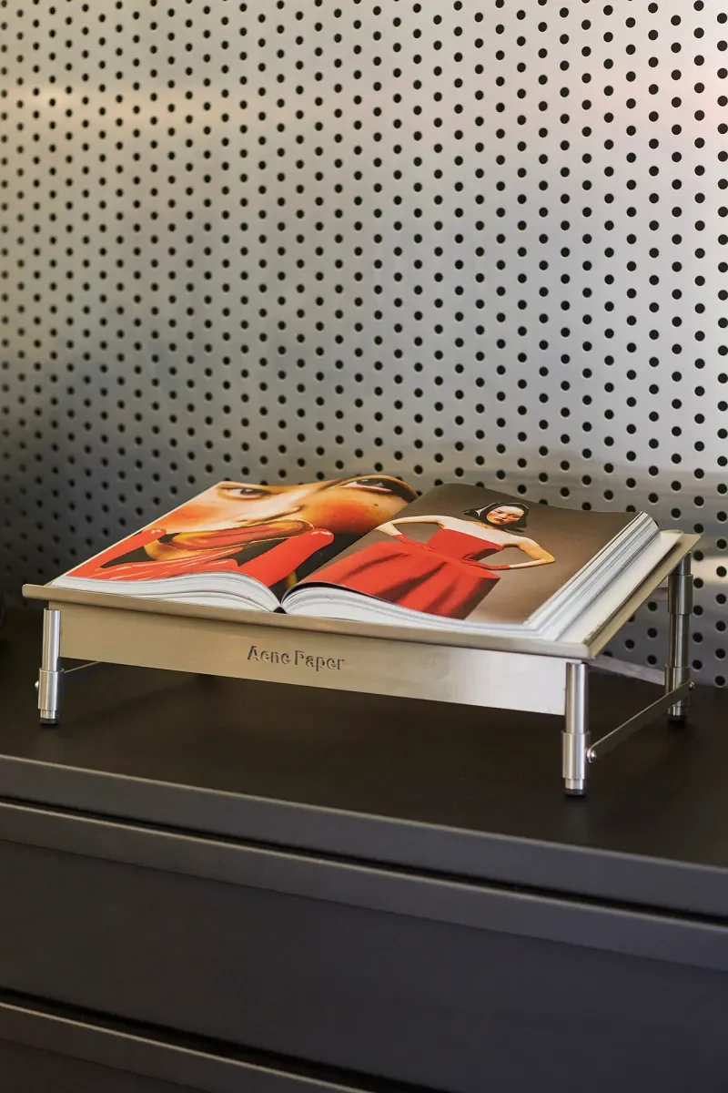 A series of bespoke stainless steel book holders were designed and crafted to accompany the enlarged cover artwork shelving units, complete with pitched roofing elements that brought architectural sophistication to the launch across Acne Studio boutiques and exclusive pop-up locations such as Harrods in London.